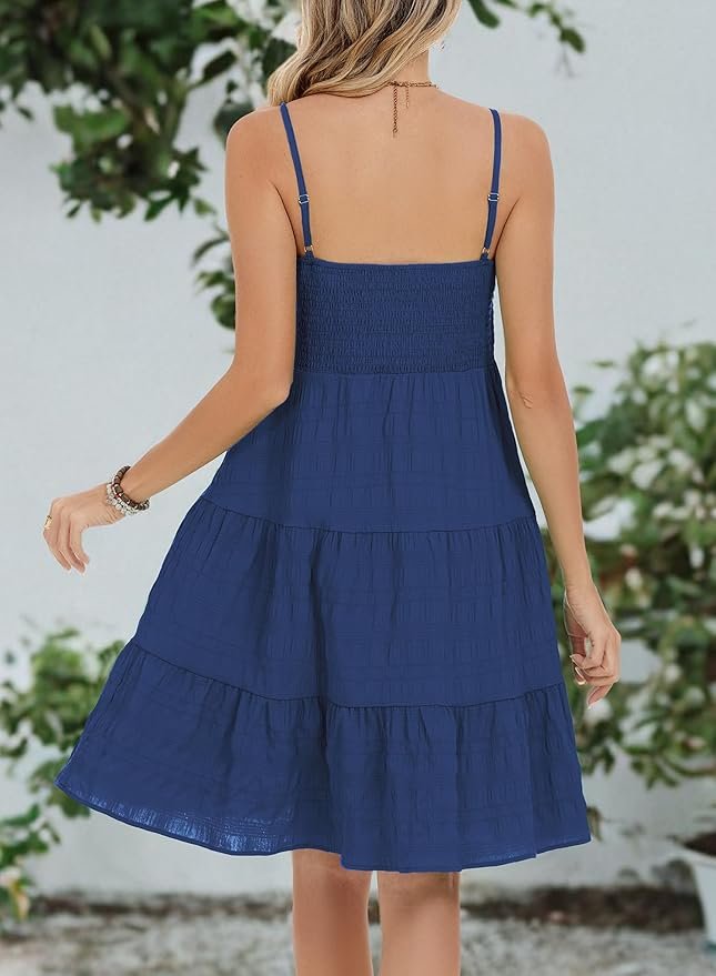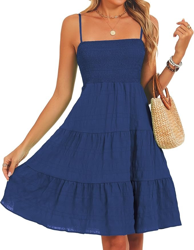 - Features: Women sleeveless dress showcases a strappy design with smocked detailing for flexible fit. Its tiered, above-knee length adds a playful touch, while the swing and skater silhouette flatters the figure and enhances movement. The high-waisted empire cut ensures an appealing shape with effortless coverage